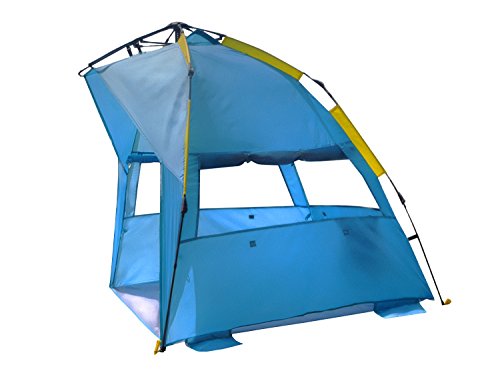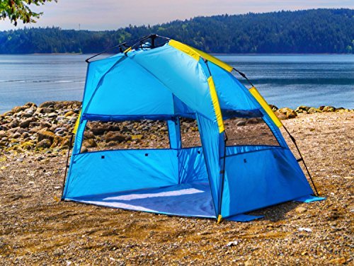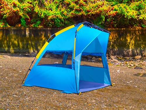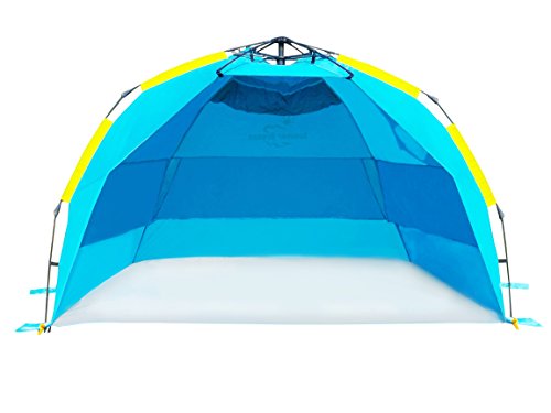 Better quality, more features: re-engineered easy setup beach tent includes upgraded fabric (210t ripstop vs 190t), covered vented roof for maximized comfort, interior storage, and SETS UP IN SECONDS