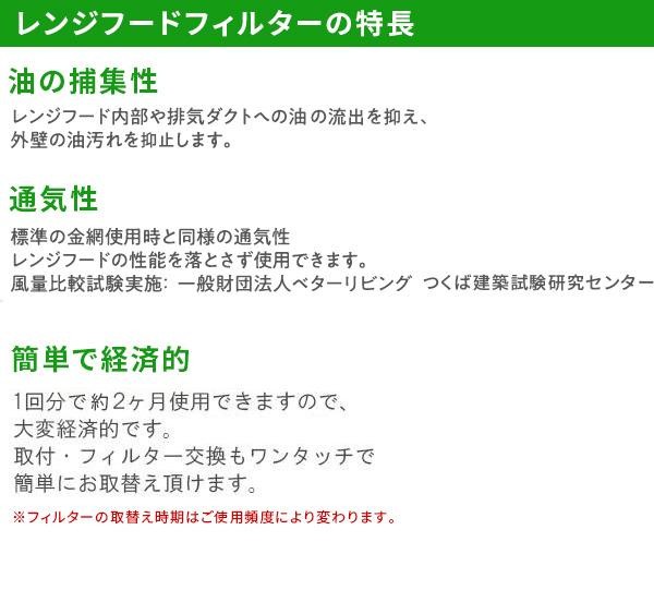 レンジフードの汚れをシャットアウト☆取付・交換がワンタッチで行える、不織布フィルターです。レンジフードのファンやモーターを汚しにくくしますので面倒な掃除の手間が簡易になります。 |