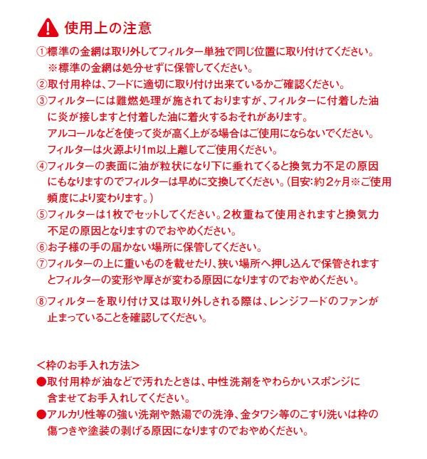 | 素材・材質 | 取付用枠:スチール(黒焼付塗装) フィルター:不織布 |