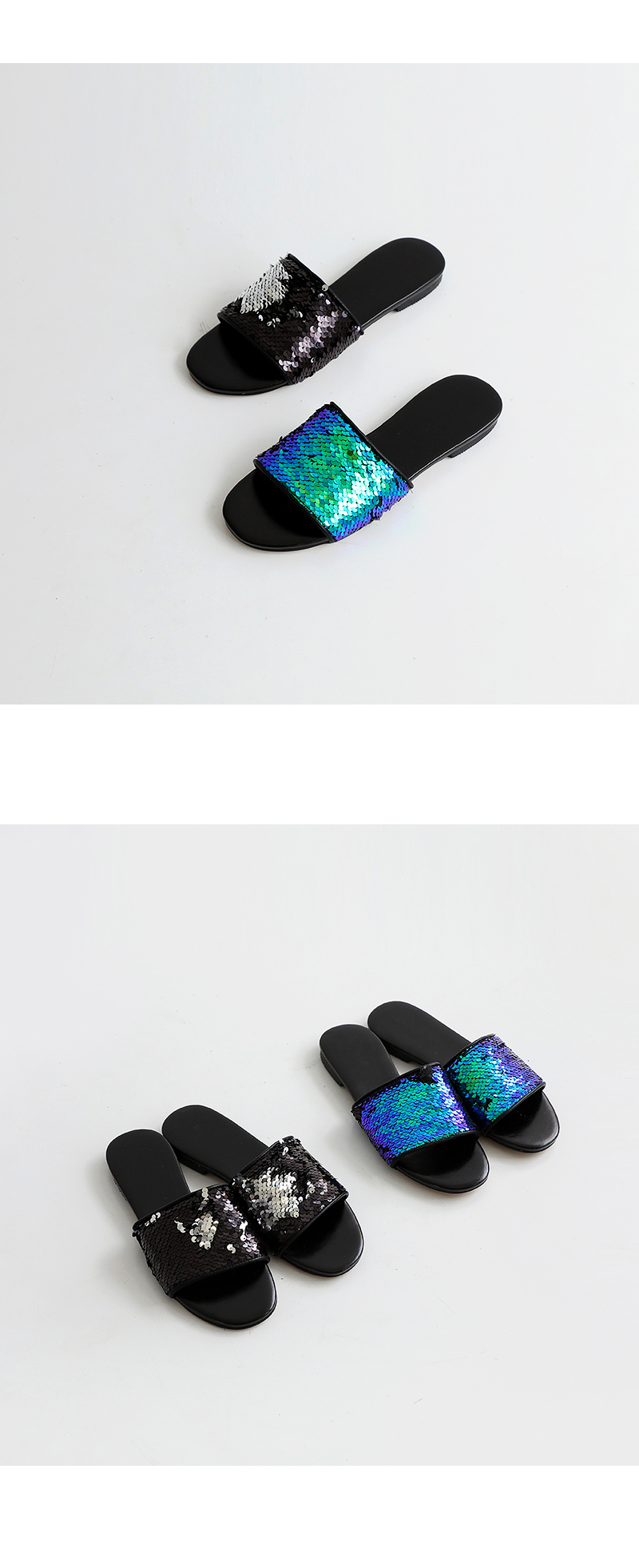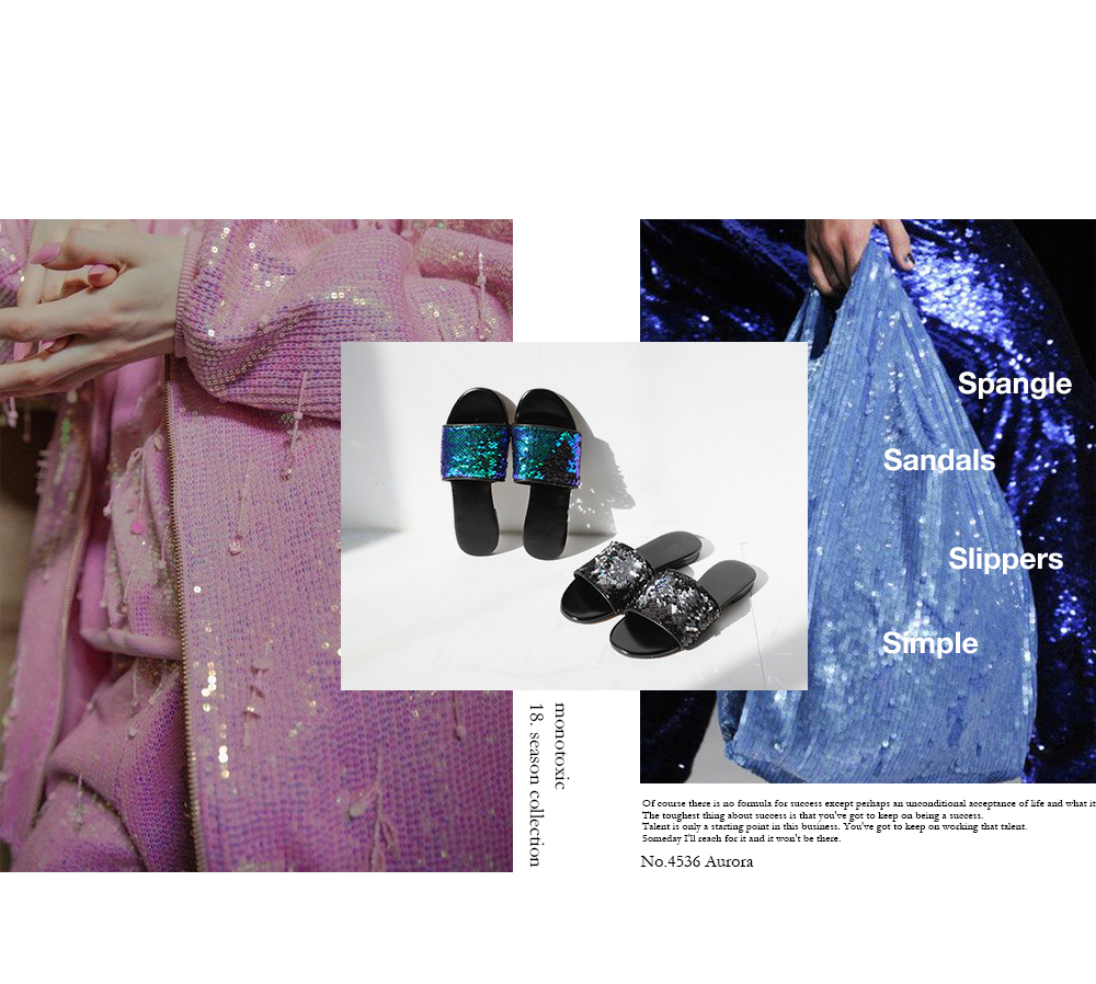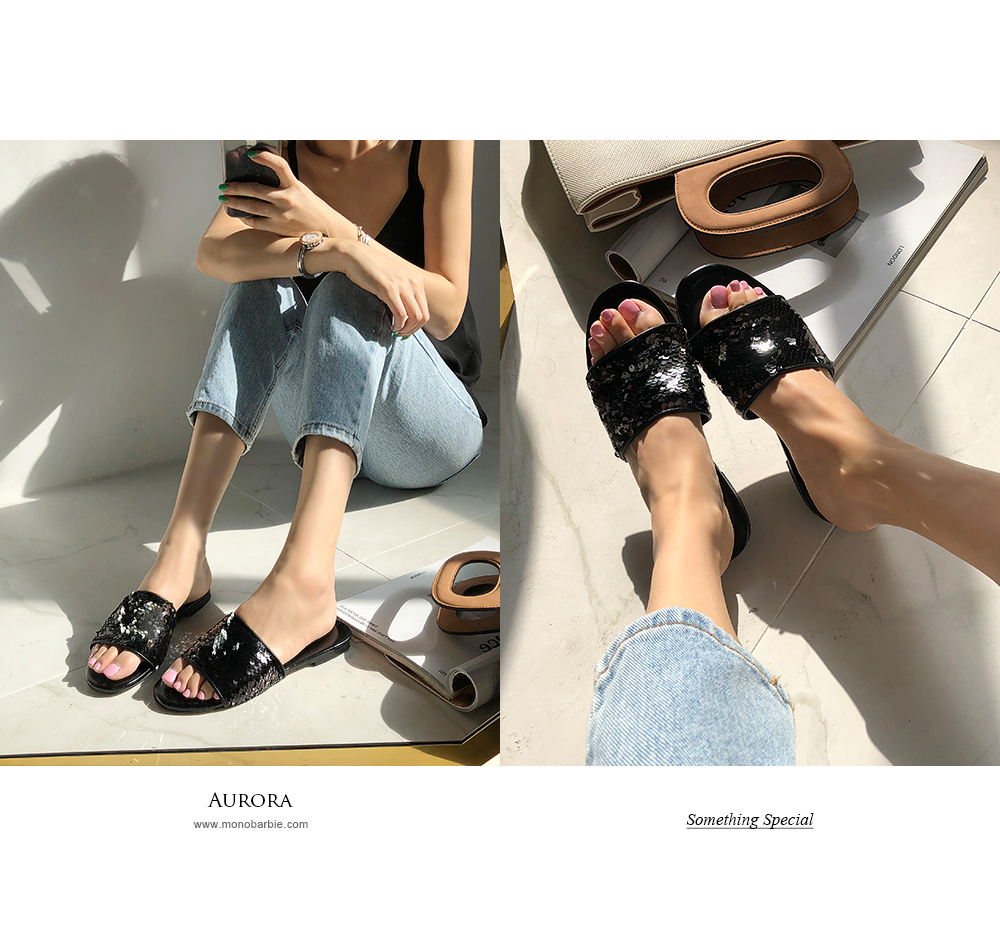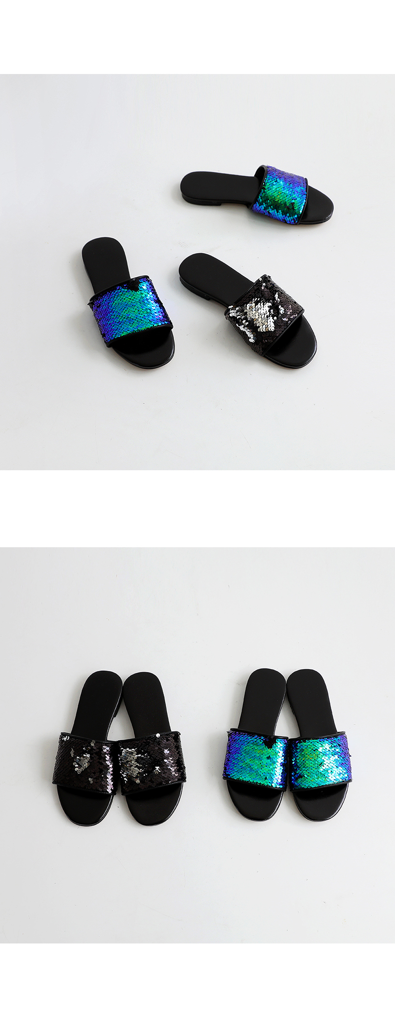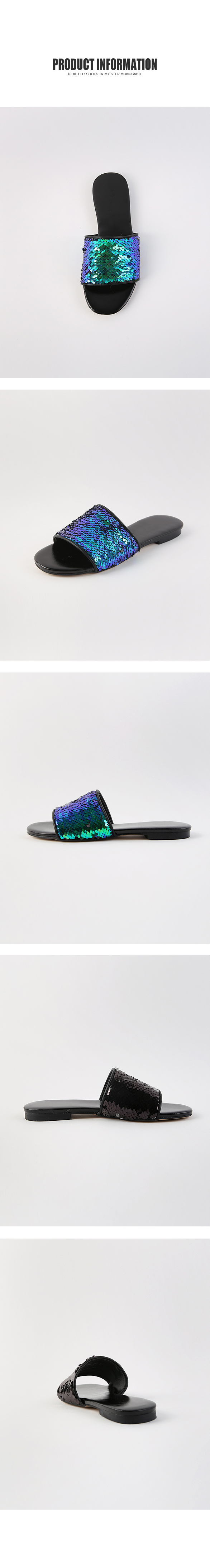 스팽글 소재로 블링블링하며 여러가지 컬러감으로 각도에 따라 컬러감이 다르게 보여 매력적이며 편안한 슬리퍼타입으로 착화해 보시길 권해드립니다.