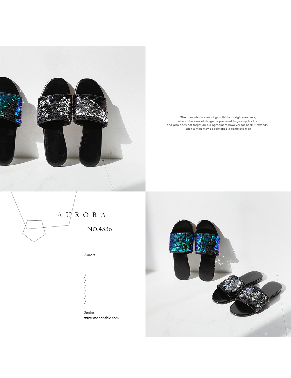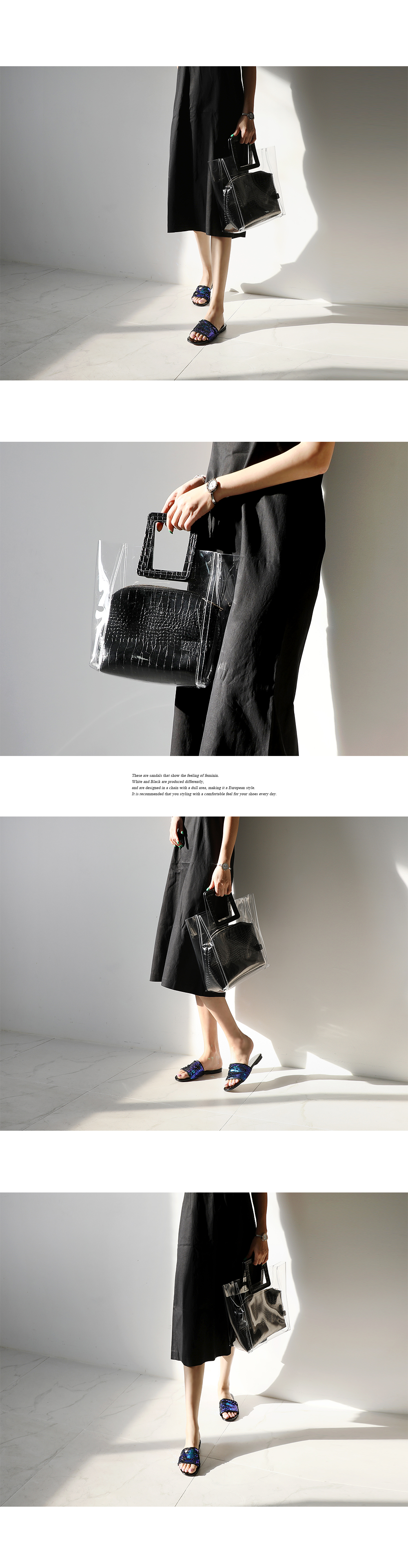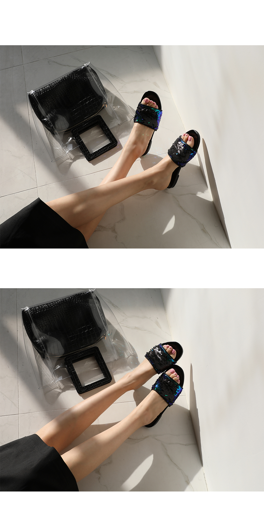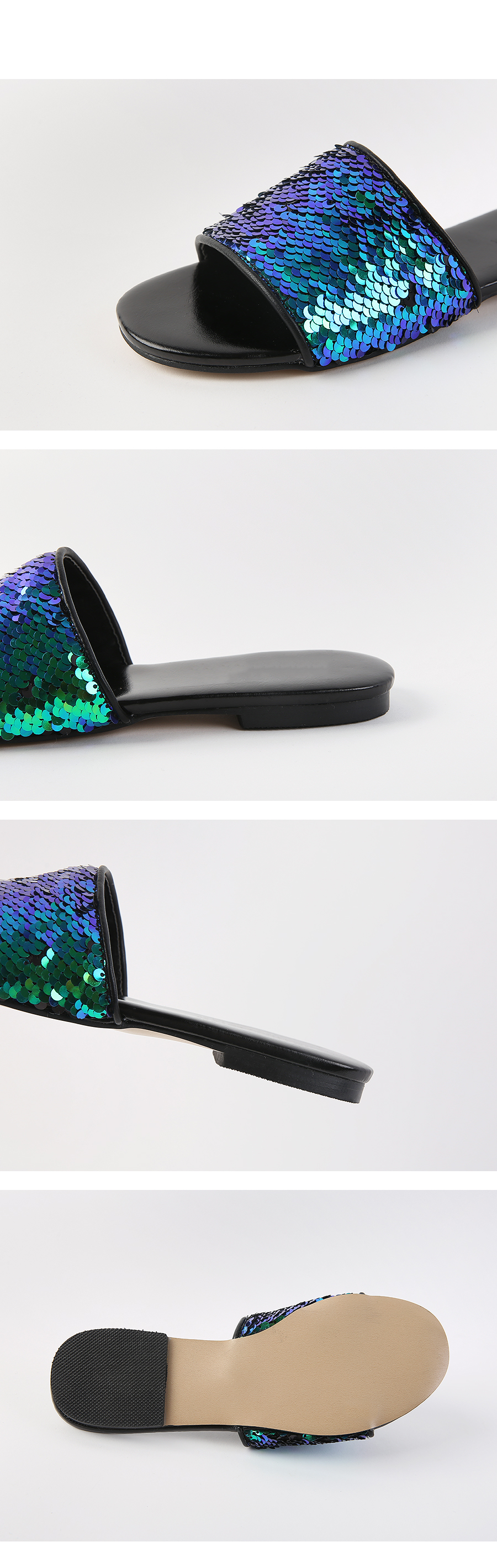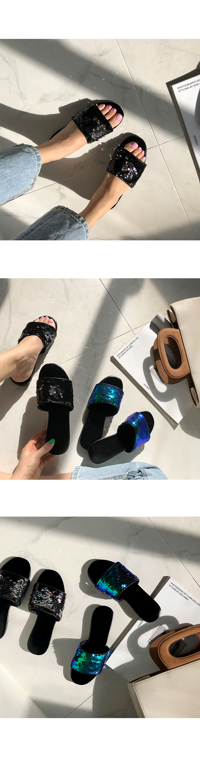 스팽글 소재로 블링블링하며 여러가지 컬러감으로 각도에 따라 컬러감이 다르게 보여 매력적이며 편안한 슬리퍼타입으로 착화해 보시길 권해드립니다.