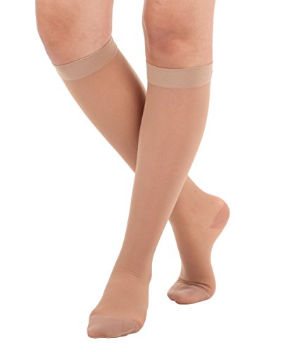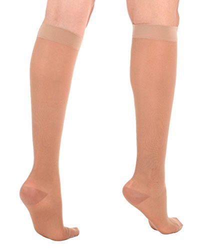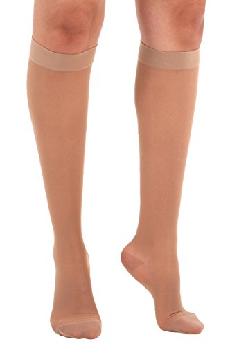 - 15-20 mmHg Compression Medium Support. Fashionable sheer fabric. Reinforced Heel and Toe.2 Inch Comfortable Soft Top Band. Looks and feels like regular knee hi fashion hose. Great quality Minor varicosities, ankle, leg and foot swelling.