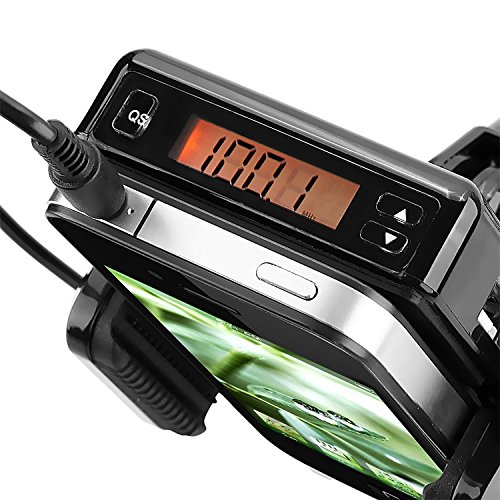 - Feature : Broadcast music from your iPod® , PDA, MP3 or CD player, and even portable DVD player with this All-in-One FM transmitter. If you want to listen to digital music simply place your iPod® or MP3 player onto the holder, tune to any FM 88.1 - 107.9 MHz station and enjoy crisp, clear audio. / Features: Suitable for all MP3 players, such as iPhone® / iPod® / Zen / Creative Zen on all cars. Plugs directly into cigarette lighter for power. Flexible goose-neck pipe for easy, comfortable positioning. / Adjustable holder keeps music player devices within reach. Type A USB socket for charging mobile phone, GPS, and other devices. 180-degree rotating head keeps your music device at a comfortable viewing angle. / High quality silicon gel on the back and sides of holder provide better grip while protecting against damage. LCD frequency display. Build-in microphone.Width range of carrying device: 37.3-mm - 62.5-mm / Color: Black. Specifications: Extendable arm width: 1.45- 2.46 inches/3.73-6.25 cm. FM Frequency 88.1 - 107.9 MHz. Input: DC 12V, vehicle power. USB output: 5V, 1A. Frequency: 20Hz - 16 KHz. Effective Distance: Package includes: All-in-One FM Transmitter. 3.5-mm M / M audio cable. 2 x USB cable (mini and micro connector). User Manual. Samsung© is a registered trademark in the United States or other countries. Samsung© does not endorse use of these products