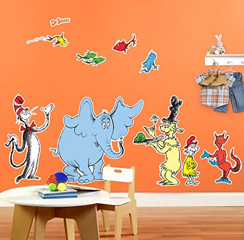 -. Feature : Includes (1) package of giant wall decals and squeegee for care and installation. Decals are made of vinyl and range in size. / Add matching tableware, favors, accessories, or a party kit bundle to complete your Dr. Seuss birthday party. / Features favorite Dr. Seuss characters such as the Cat in the Hat, Thing 1 and Thing 2, Horton, and Sam I Am.