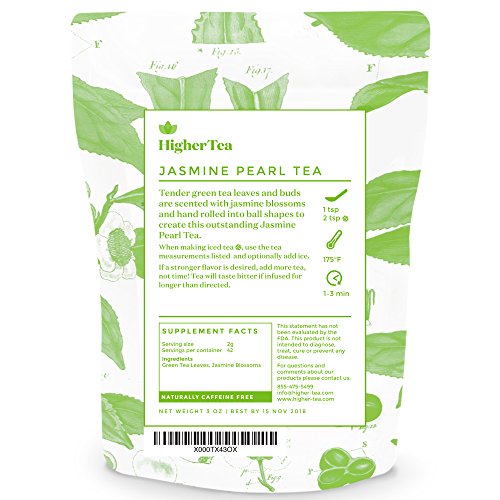 JASMINE PEARL TEA: Tender green tea leaves and buds are scented with jasmine blossoms and hand rolled into ball shapes to create this delicate Jasmine Pearl Tea.