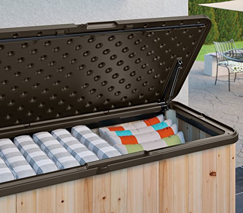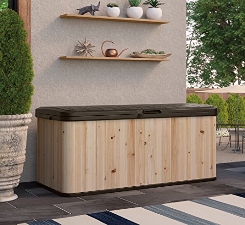 -. Brand : Suncast -. Feature : Dimensions: 54.5L x 27.5W x 24.25H in. / Built from cedar and plastic / Natural wood color with java top and base / 120-gallon decay-resistant storage area / Lockable resin lid with gas shocks -. Label : Suncast Corp -. Manufacturer : Suncast Corp -. MPN : WRDB12000 -. PackageQuantity : 1 -. PartNumber : WRDB12000 -. ProductGroup : Lawn & Patio -. ProductTypeName : OUTDOOR_LIVING -. Publisher : Suncast Corp -. Studio : Suncast Corp -. Title : Suncast Extra Large Cedar and Plastic 120-Gallon Deck Box - WRDB12000