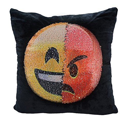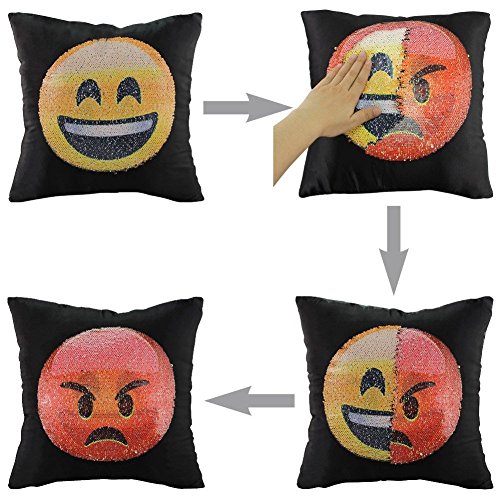 Sequin Pillow Case, Mermaid Emoji Pillow Case, COOLANS Reversible Changeable Face Sequin Pillow Cover, DIY Pillowcase for Sofa Home Decorative 16 X 16” (Happy/Angry)