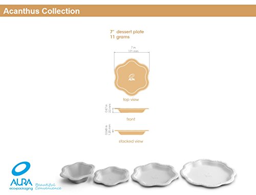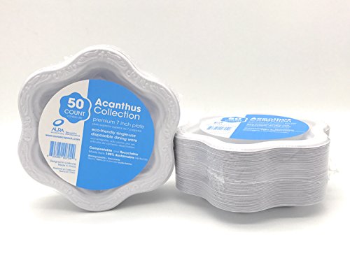 [50 COUNT] 7" inch Disposable Floral Small Premium White Plates - Acanthus Collection Natural Sugarcane Bamboo Fibers Bagasse 100% Byproduct Eco Friendly Environmental Plastic Paper Plate Alternative