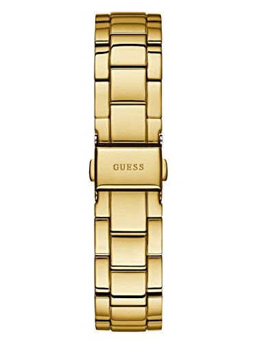 Analog timepiece delivers a glimmering accent with a glittered dial and rhinestone-studded case. Gold-tone stainless steel bracelet.