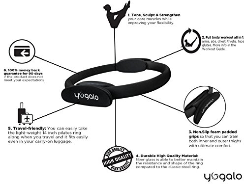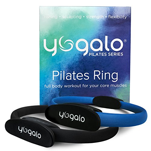 Studio : Yogalo Publisher : Yogalo Binding : Misc. Product Description Yogalo Pilates Ring with NON-SLIP foam padded grips, 14 inch ring diameter, offers a full body workout for toning, sculpting and improving strength and flexibility of your core muscles: arms, abs, chest, thighs, hips, hamstrings and glutes with optimal resistance. It is made of high quality fiber glass material covered by rubber maintaining its resistance and shape even after extensive use. Thanks to the light material and the padded dual grip 360 degree handles you will have optimal comfort for all positions. If you're new to pilates ring workouts, you can follow the workouts recommendations in the workout guide that comes along with the ring to get you started. This ring is an upgraded version of the traditionally known Magic Circle. 0