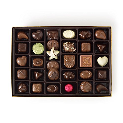 -. Feature : 70-piece gold gift box with hand-tied pink Birthday Ribbon / 70 assorted milk, dark, and white chocolates with ganache's, pralines, caramels, fruits and nuts / 70 pcs. (1 lbs., 12.75 oz.)