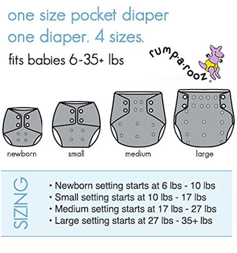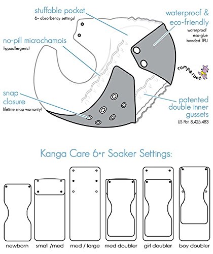 The award winning Rumparooz One Size Cloth Pocket Diaper is a revolutionary change to the face of cloth diapering. Kanga Care brand cloth diapers are the only cloth diapers uniquely designed with the patented leak protection technology of dual inner gussets. Designed with simplicity, Rumparooz are as easy to use as a disposable diaper, but without all the chemicals, waste and high cost. The Rumparooz One Size Cloth Pocket Diaper is 4 diapers sizes in ONE diaper. Everything you will need from birth (6 pounds) to potty training (35 pounds). Each diaper comes with a microfiber 6R soaker. This unique soaker has 6 different size and absorbency settings to customize for your babies needs. TO USE: Before first use, wash diapers once. Snap diaper rise to proper size setting. Select the proper 6R soaker and insert through pocket opening, placing soaker inside the diaper. Fasten diaper to baby! WASH & CARE: 1. Cold Rinse, no detergent. 2. Hot Wash/Cold Rinse with the suggested amount of detergent (see www.kangacare.com for full list of recommended detergents). Tumble dry low or lay flat to dry (diapers dry FAST!) All Kanga Care products are designed and invented by Julie Ekstrom, mom and CEO of Kanga Care, and distributed worldwide out of Golden, CO.Feature