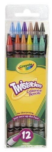 -. Feature : Crayola-Twistables colored pencils in 12 brilliant colors / These twistable colored pencils put a new spin on creativity; just turn the ends to twist up 12 brilliant colors / See the colored leads turn inside the clear plastic barrels / There is no sharpening needed / 12 different colors