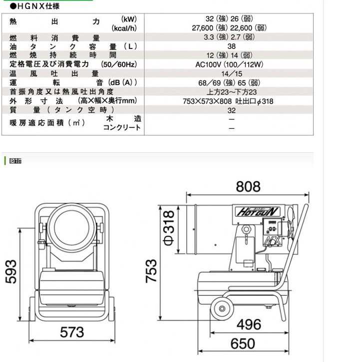 ●暖房の目安:72畳(123[[平米]])(木造)、101畳(172[[平米]])(コンクリート)