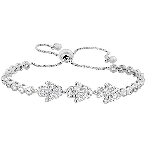 -. Feature : This bracelet features a fashionable design showcasing a three Hamsa-shaped charm sparkling with a pave of beautiful white CZ stones. Beautiful white CZs complete the look of this adjustable bracelet. A rubber base clasp on this adjustable bracelet allows to lock the jewelry securely around your wrist. Look and feel great with this designer bracelet! / Metal Type: Plated-Silver. Metal Stamp: 925-Sterling. Gender: Womens. Item Display Length: 9 in.Setting Type: Pave. Clasp Type: Adjustable. Chain Type: Gem Type: Cubic-Zirconia. Stone Shape: Round-Brilliant. / The bracelet showcases an elegant design of the Hamsa charm set onto a delicate link chain and sparkling with gorgeous white CZ stones that decorate this unique pendant. / The Hamsa symbol is believed to protect the wearer from bad luck. Get it for your loved one, or treat yourself for a classic timeless style. / This elegant Sterling Silver hamsa bracelet is handmade with superb craftsmanship and offered in jewelry gift box