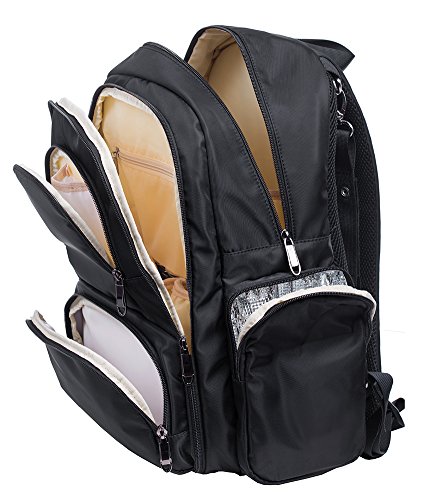 Very Large space and 16 pockets :4 insulated bottle holder,2 super Waterproof PEVA Pockets for wet item, one special pocket for pacifier, laptop sleeve inside, etc. large capacity that caters to two different age groups