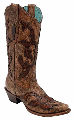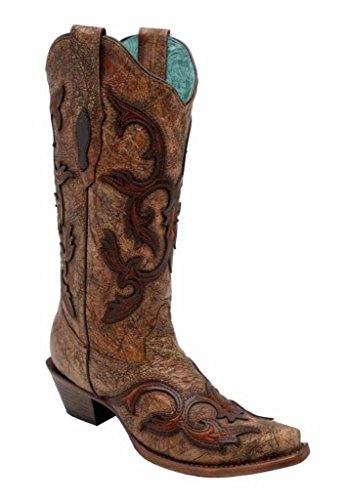 Studio : Corral Boots Publisher : Corral Boots Binding : Apparel Product Description Bring some stylish flavor to your outfit wearing these uniquely-designed women's boots. Handcrafted in cognac leather, these boots stand out in fashionable flair. Patch with swirl stitch design. Shaft: 13". Toe type: Snip toe. Material: Leather. 0