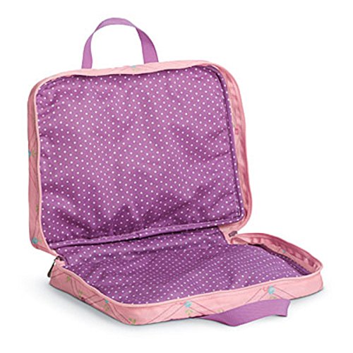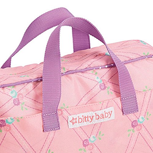 Bitty's Diaper Bag features a diamond "quilted" print, polka-dot corner patches, a pair of carrying straps, and exterior pockets for storage
