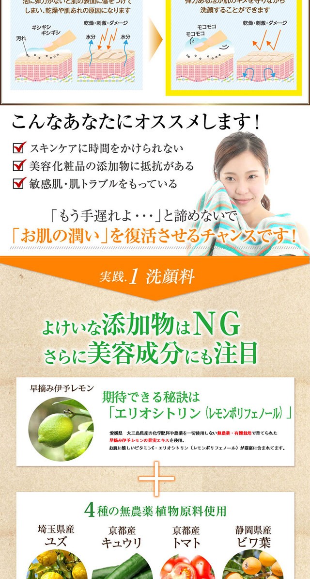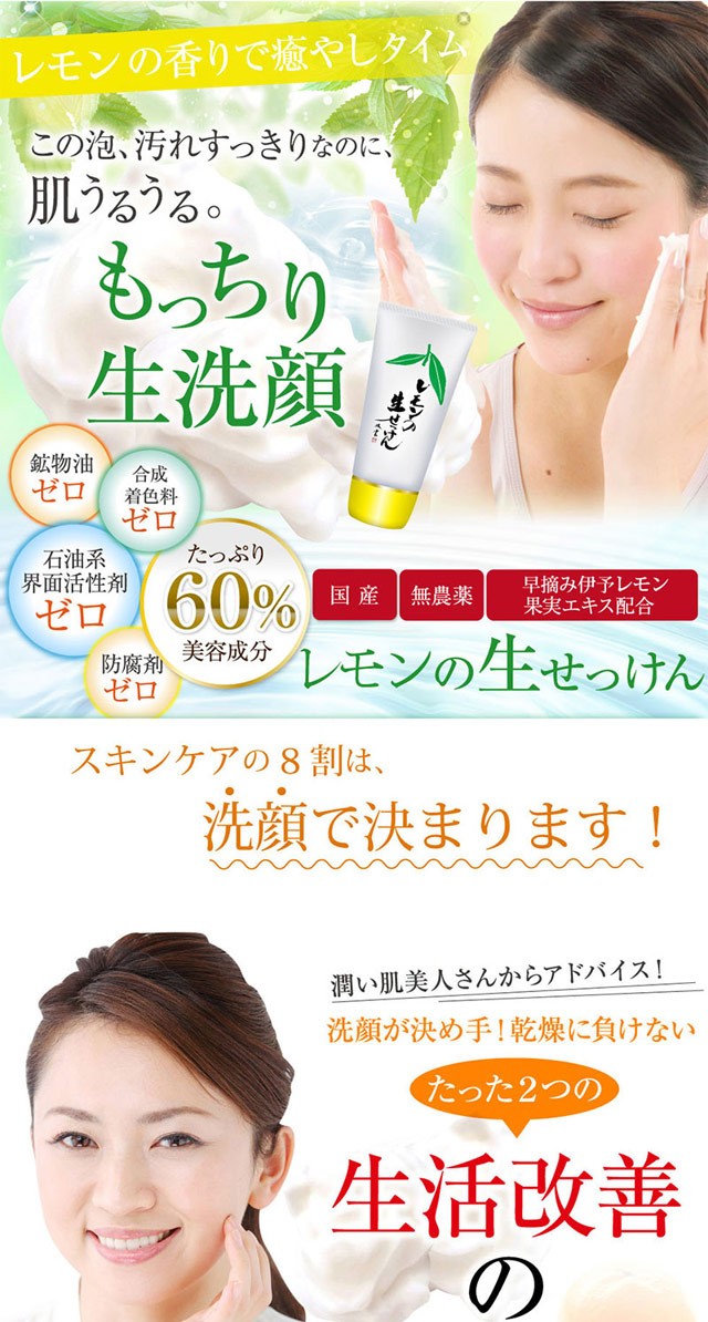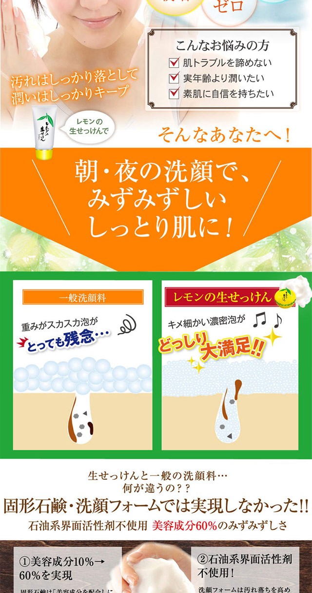 お肌に負担なく汚れを取り除く、新発想のうるおい生せっけんです。