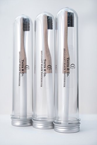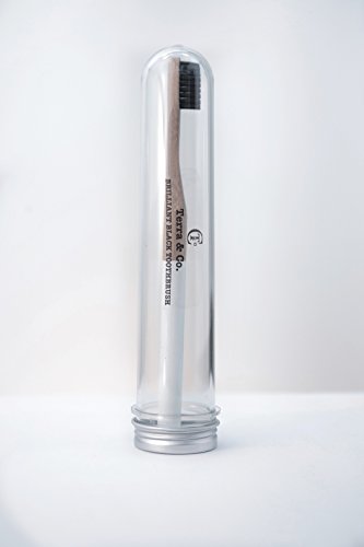 Brilliant Black Toothbrush includes 100% Biodegradable toothbrush made out of sustainable wood-bamboo and nylon (BPA-free) bristles that are activated charcoal infused for teeth whitening! The toothbrush comes in original Terra & Co. travel case.