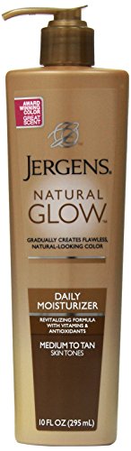 -. Binding : Health and Beauty -. Brand : Jergens -. EAN : 0019100195714 -. Feature : Erythrulose and DHA provide gradual color development over the course of a week to create a natural-looking glow / Jergens natural glow daily moisturizer now comes ina convenient pump form / Infused with botanical blend of antioxidant and vitamin e / Keeps skin looking healthy -. Label : KAO Brands -. Manufacturer : KAO Brands -. NumberOfItems : 1 -. PackageQuantity : 1 -. ProductGroup : Pantry -. ProductTypeName : BEAUTY -. Publisher : KAO Brands -. ReleaseDate : 2015-03-06 -. Size : 10 Ounces -. Studio : KAO Brands -. Title : Jergens Natural Glow Daily Moisturizer, Medium to Tan, 10 Ounce -. UPC : 019100195714