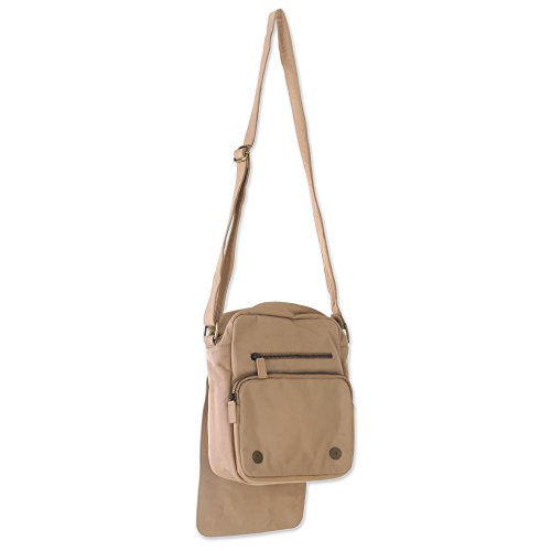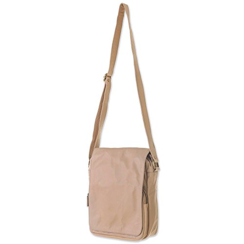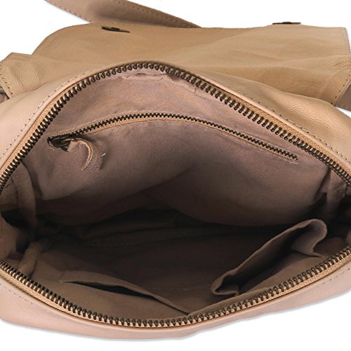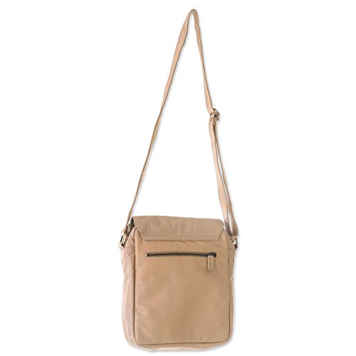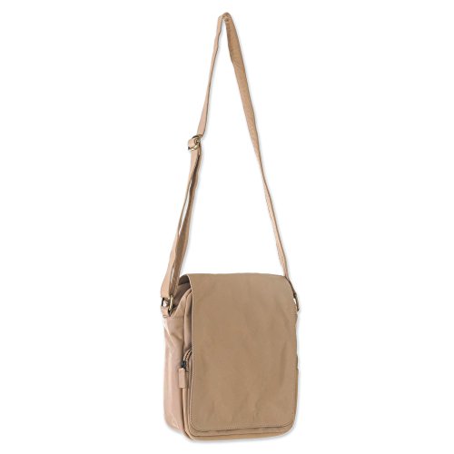 About this item: Carry everything needed for a worldly adventure in this functional and stylish beige leather shoulder bag handmade by Indonesian craftsman Tuniyaton. Lift the handbag's front flap, which is secured with magnetic buttons, to reveal two zippered compartments. The back side of the bag also includes a zippered pocket. The interior of the shoulder bag is lined with a cream colored polyester lining making locating items a breeze and the zippered and two open pockets makes this an organizational dream. The bag's shoulder strap is adjustable and finished with brass fixture Bag: 9.0" H x 7.75" W x 3.1" D Strap: 24.5" min L - 49.0" max L x 1.0" W Strap drop length: 11.75" min L - 22.75" max L - Adjustable strap(s)