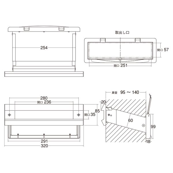 ●スペック:受口部:幅(mm)320 高さ(mm)85 取出し口開口寸法:幅(mm)251 高さ(mm)57 壁厚調整範囲95~140mm