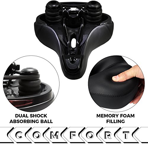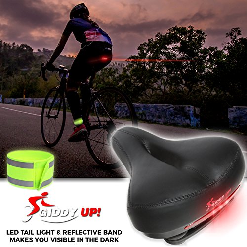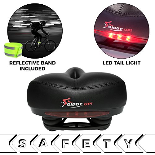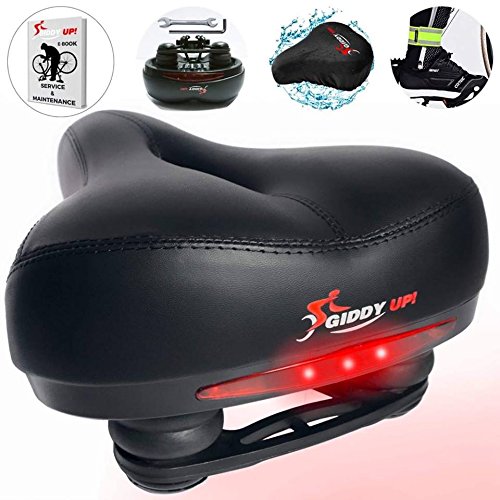 FEATURES ? Memory foam material which provides a comfortable riding experience. ? Seat covered in leather that provides a classy aspect and also makes the seat waterproof. ? Shock absorbing ball which ensures a smoother ride when traveling off-road or on bad levelled roads. ? Universal fit that allows you to mount the saddle on almost every bicycle. ? LED tail light to improve your visibility when riding during dusk or night. GENERAL DESCRIPTION ?Comfortable and safe Made from high quality leather and filled with the memory foam this seat offers you the most comfortable ride you will ever have. It also comes equipped with a LED taillight so you and your loved ones feel safe riding the bike at any time of the day. ? Ride it anywhere Easy to install. It fits any standard bicycle and it comes with a protection cover so you can take it anywhere you like. And since safety comes always first and we want you to ride your bike everywhere we give you a bonus reflective band ! ? Perfect choice This is the perfect gift for your loved ones. Also is best way you can get to ride your old bike with the comfort and safety of a new bike. BUNDLE INCLUDES ? Bike seat with LED tail light ? Waterproof protection cover ? Reflective band ? Mounting set - Wrench Allen key ? CR2032 battery ? E-book 0