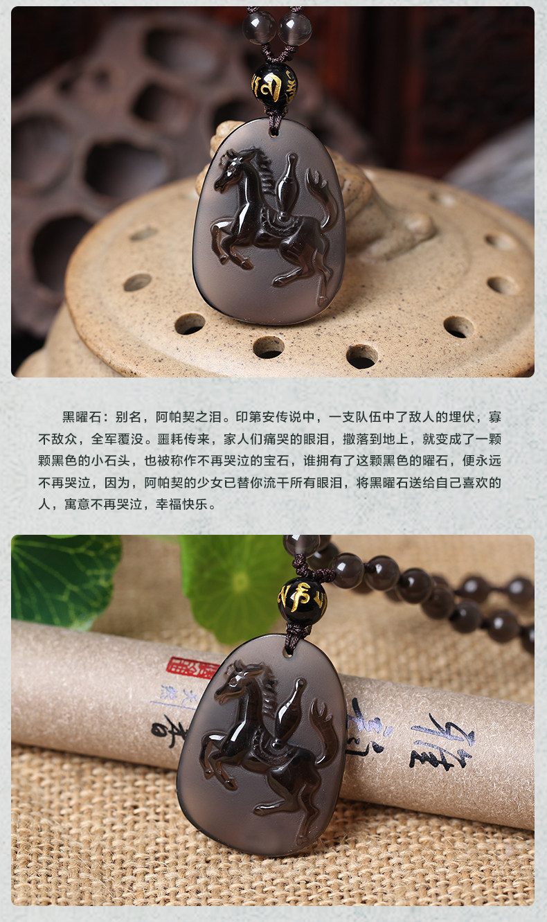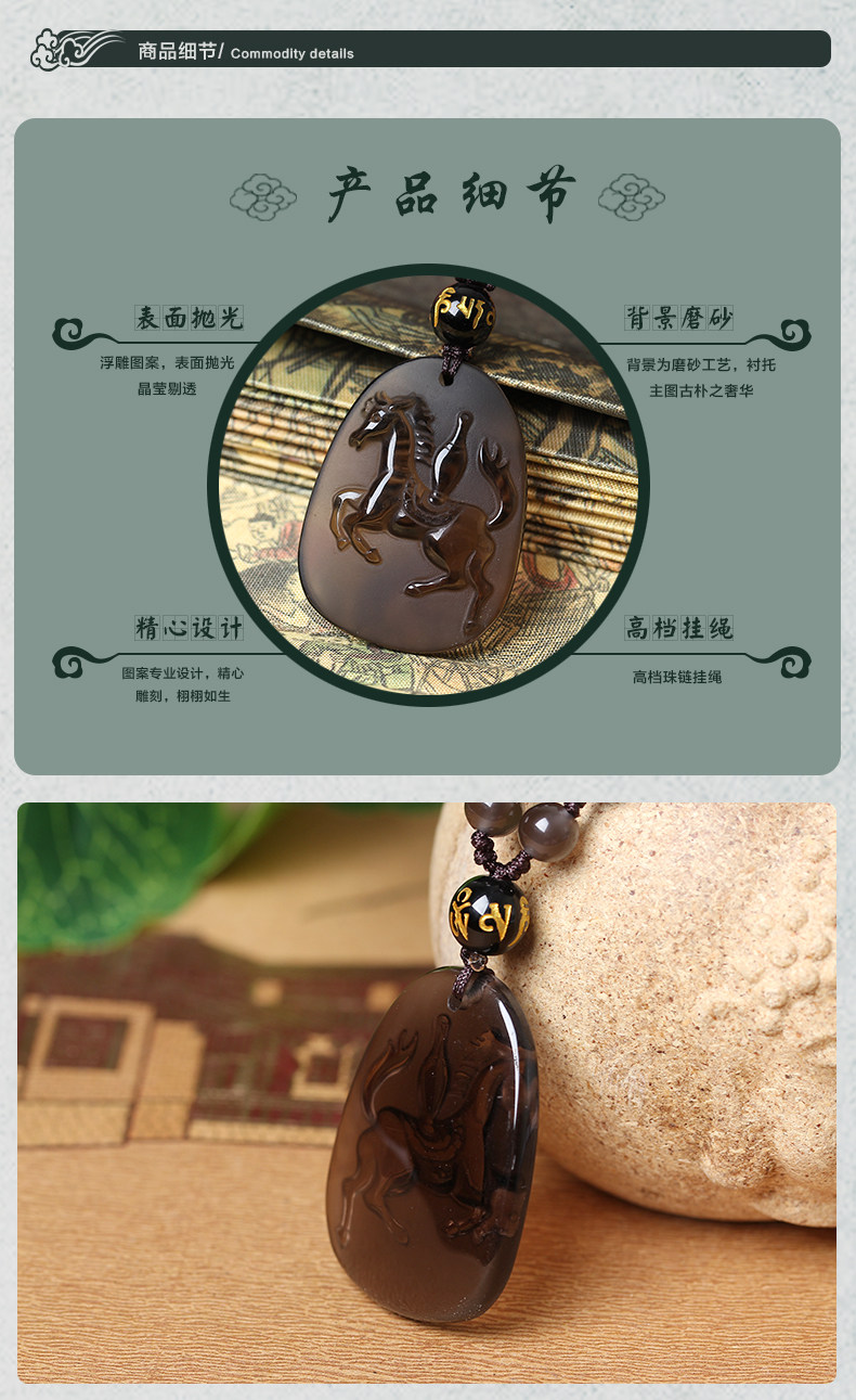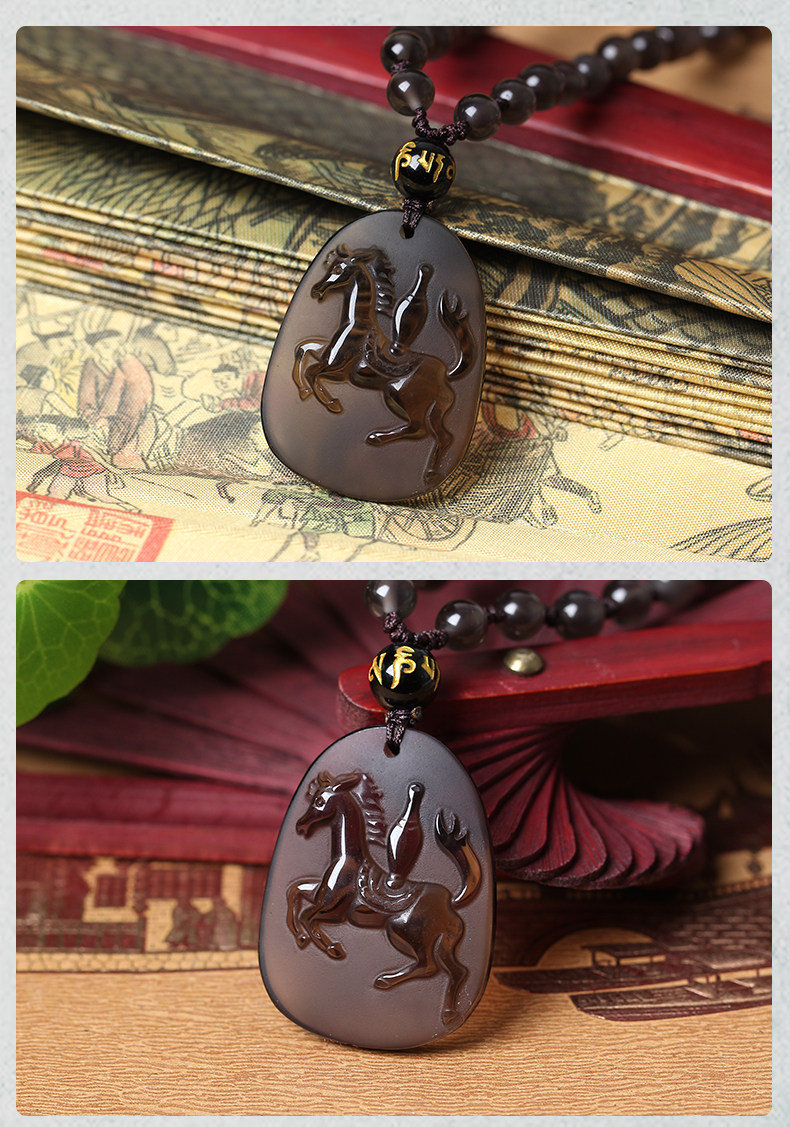 开光属马神骏登峰冰晶黑曜石吊坠开光吉祥物项坠