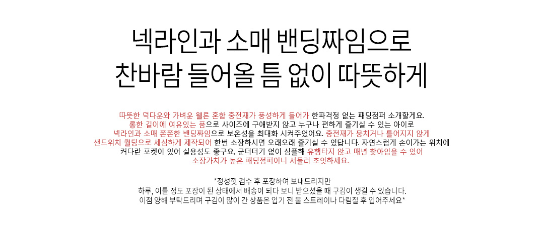 | 소재(Material) | 폴리에스테르(polyester/)100%안감폴리에스테르(polyester/)100%충전재(Filler/)오리털(duckdownyhair/)50%+웰론(wellon/)50% | |