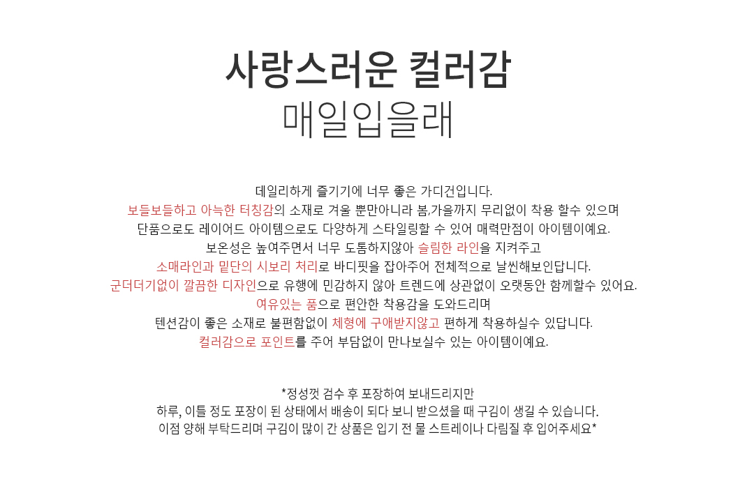 ※ 블랙컬러는 특성상 물빠짐이 있을수 있으니 꼭 ! 옷에 맞는 세탁법으로 세탁한 후 착용바랍니다.