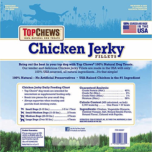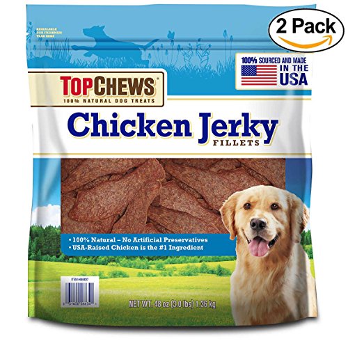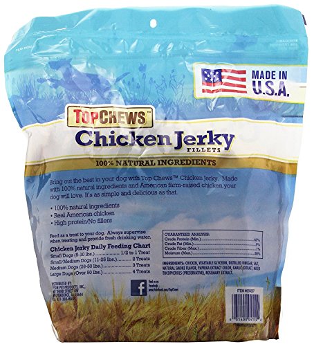 -. Feature : Treat your pooch to these Top Chews Chicken Jerky Fillets. Made of 100 percent natural ingredients, they're high in protein and are made with real American chicken. / These Top Chews chicken fillets do not contain any fillers, and they're ideal for feeding to your pet as a treat. / High in protein, these tender and delicious chicken jerky fillets are made in the USA with only 100% USA-sourced, all natural ingredients. NO fillers. NO artificial preservatives. / 2 Pack - Resealable 3 lb bags (48 oz each) / Calorie Content (calculated): ME=3,767 kcal/kg; 37 kcal/piece