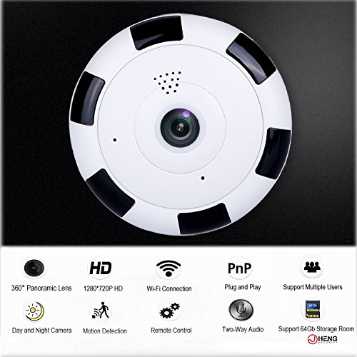 -. Feature : Plug and Play, Easy set up the Wi-Fi connection. Support 2.4G WIFI, it CAN'T support 5G. Support iOS and Android only. Prepare the Quick Start Guide for customer (paper version and digital version) / 720p HD Wi-Fi Camera, the network camera will auto switch to night vision; Fisheye 360° panoramic view angle, monitor the entire room (10M*10M)100 ㎡ with no blind area, applicable to different monitoring scenarios, supporting 5 different viewing modes / Support Remote Control, Two-Way Audio, whenever you go you could monitor your surveillance place and speak to it under WIFI environment through App (Smart phone for IOS and Android only, PC for windows only) / MOTION DETECTION AND LOOP RECORDING - Whenever any motion is detected, dome camera sends alert on user's mobile phone or with sound notification. It also auto recovers the earlier video files when TF storage room is full.(max support 64 Gb, approx. 30days recording, TF Card NOT included) / Easy to install: The camera will be installed on ceiling or wall, all the accessories will come with the WIFI Surveillance Camera, no need to buy extra bracket to mount it