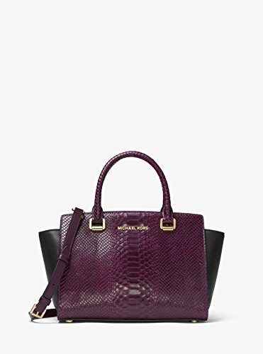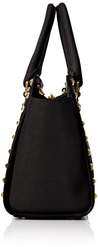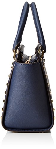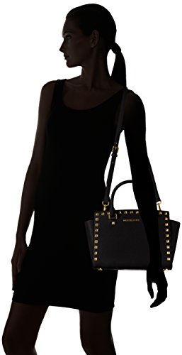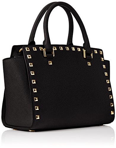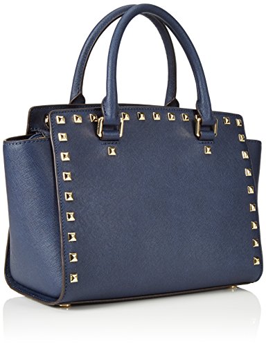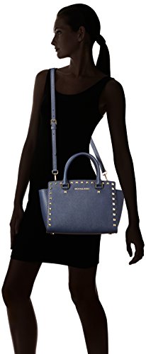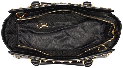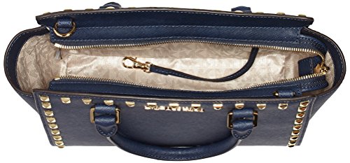 Product Description A luxe saffiano leather MICHAEL Michael Kors satchel in a classic silhouette, accented with polished studs. Logo lettering details the front, and the zip opens to a logo-lined interior with 3 pouch pockets and 1 zip pocket. Metal feet. Rolled handles and optional shoulder strap. Dust bag included. 0