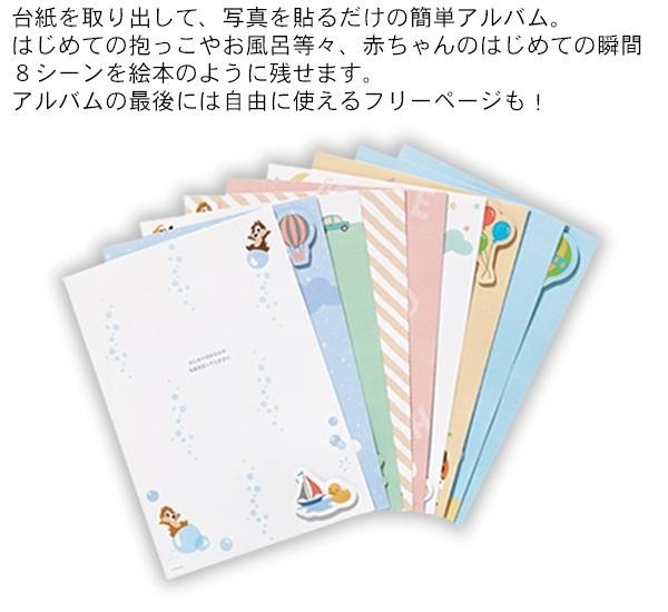 | 台紙に写真を貼るだけで簡単に絵本のようなアルバムが作れます♪ミッキーと仲間たちのかわいいデザインで、自分の子どもの成長記録はもちろん、祖父母への成長報告や出産お祝いギフトにもおススメ!! |