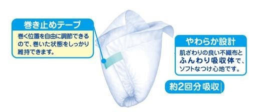 | 素材・材質 | 表面材:ポリオレフィン不織布 吸水材:綿状パルプ/吸水紙/高分子吸収材 防水材:ポリエチレンフィルム 止着材:粘着テープ 伸縮材:ポリウレタン糸 結合材:スチレン系エラストマーなど |