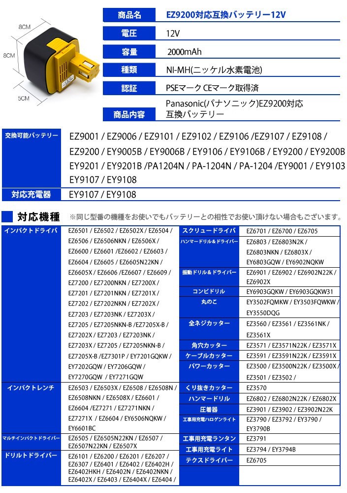 商品名 : EZ9200対応互換バッテリー■電圧 : 12V■容量 : 2000mAh■種類 : NI-MH(ニッケル水素電池)■認証 : PSEマーク CEマーク取得済
