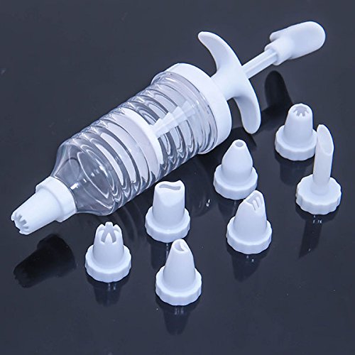 Product Description Description: This piping set can be used for decorating cakes for all occasions! 100% Brand New and High Quality Material:Plastic Easy to use and clean. Great for icing, piping and general cake decoration. Plastic construction. Come with 8 different screw on nozzles. Cake decorating syringe. Color: White Approximately 18cm (7inch) in length (with handle fully inserted) 0