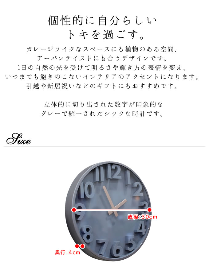 ポイント立体的に切り出された数字が印象的なグレーで統一されたシックな時計です。