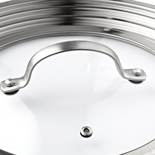 Studio : Cook N Home Publisher : Cook N Home Binding : Kitchen Product Description The Cook N Home Stainless Steel with glass center universal lid, fits 8 to 12-Inch is made of 18/10 Stainless Steel with a tempered glass insert. Fits 8 in./20 cm, 10.25 in./26 cm, 11 in./28 cm, and 12 in./30 cm pans and pots. Tempered glass center with steam hole vent to view cooking. Dome convex center prevents food contact and handle is riveted for strength. Dishwasher safe and oven safe to 350F. 0