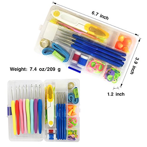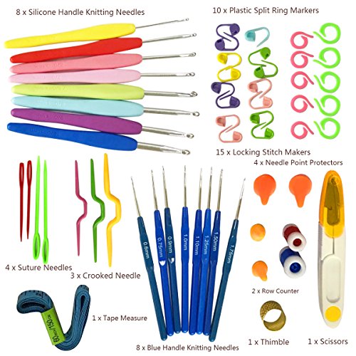 - [WHAT YOU GET] Besides the 16 size crochet hooks, there are 15 x Locking Stitch Makers, 4 x Needle Point Protectors, 4 x Suture Needles, 3 x Crooked Needle, 2 x Row Counter, 1 x Thimble, 1 x Scissors, 1 x Tape Measure. Everything you need to crochet is included in this crochet accessories kit, stay organized, never lose anything again and have the tools to take on any project! Perfect for traveling or crocheting everywhere