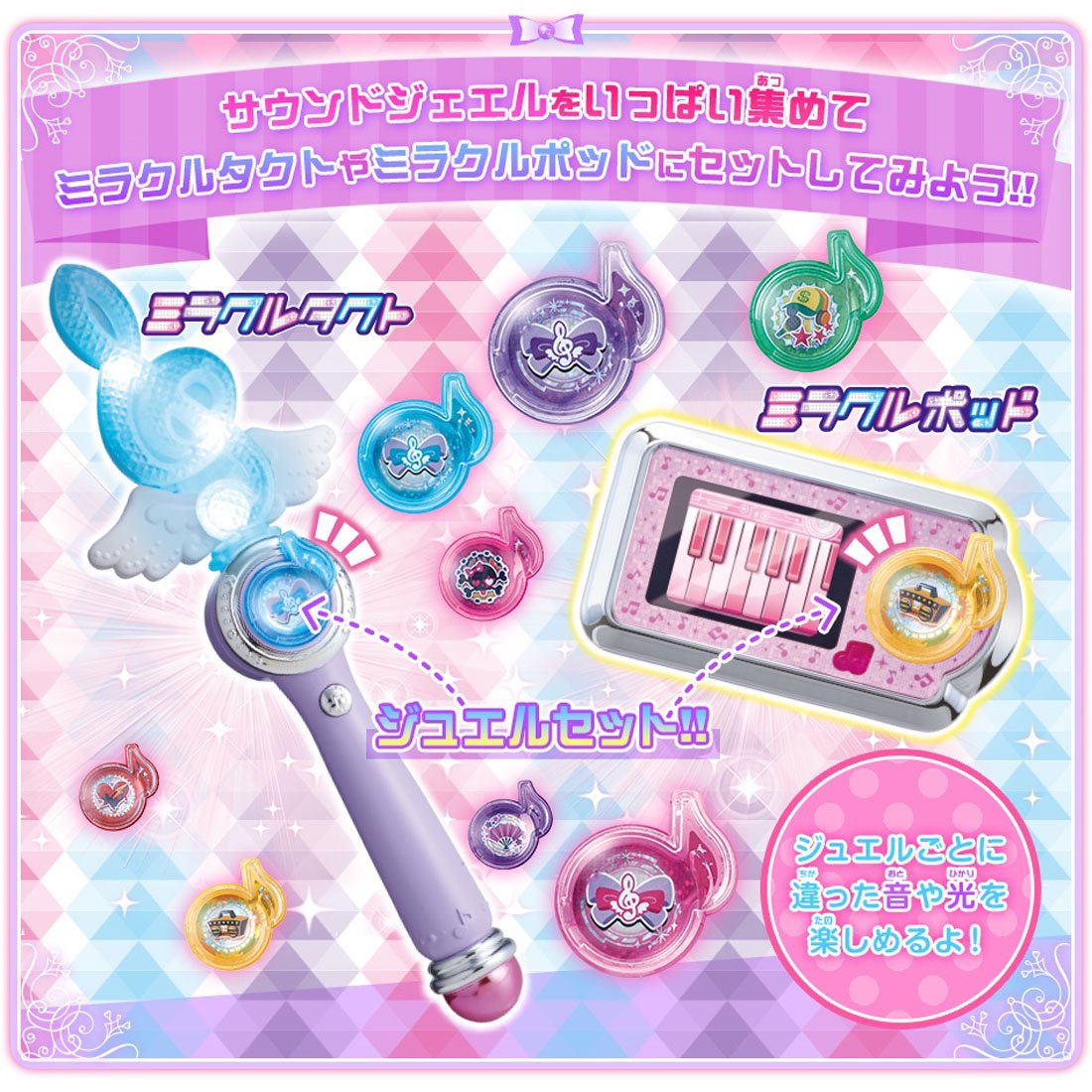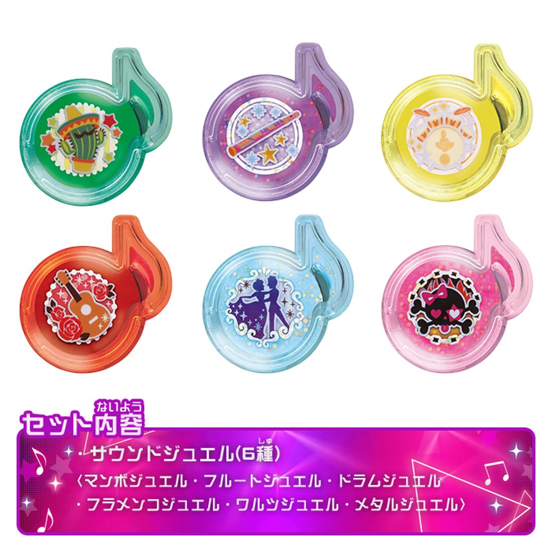 Sound jewels of set contents include three kinds of holo specifications (flute jewel, waltz jewel, metal jewel, flamenco jewel, drum jewel, mambo jewel).