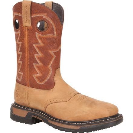 Studio : Rocky Publisher : Rocky Binding : Apparel Product Description You can have great-looking waterproof western work boots that are comfortable. The RockyOriginal Ride Western Boot is all about sole performance and interior comfortThese men's boots are designed with the eight-layer Rocky Original Ride performance system with dual-density oil-resistant and slip-resistant rubber outsoles. A right-angle heel and embedded safety grooves make the Rocky Ride outsole ideal for all work environments, including ladders and stirrups. These are waterproof boots made with the Rocky Waterproof System. Air flows in, but water stays out. Your feet stay dry. Guaranteed. The Rocky Original Ride is made with the perfect amount of protective features, comfort and sturdiness. Layers One and Two of the eight-layer system are the orthotic form and rear foot cradle. Layer Three is an upper enclosed cushion. The top layer is cushioned and perforated. After wearing your work boots for a while, this layer forms to the contours of your footLayer Four is a welt innersole with a Flex Facilitator. This gives your boots super flexibility. Next, there's the full-length EVA midsole. That's Layer Five. It absorbs shock, but is really lightweight. Layer Six is the double-ribbed tempered steel shank. It provides stability and extends the life of the boots. Layer Seven is the forefoot propulsion pad and rear foot landing pad. This is a unique two-part highly-cushioned system that increases three things: shock absorption, flexibility and comfort. Finally, check out Layer Eight. The Rocky Ride Outsole is a rubber work platform outsole that is oil-resistant and provides secure footing. The forefoot and rear section have a softer density to give you sure-footed traction. These 11-inch men's western work boots have full-grain leather uppers. The foot is tan paired with an ochre shaft that features stitching detail. The boot has both pull straps and pull loops, as well as a great western square toe. 0