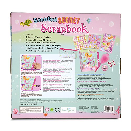 UNLIKE MANY OTHER THIN SCRAPBOOK SETS WITH VERY FEW EMBELLISHMENTS, this set includes the following: 9" x 7" 60 Page scented secret scrapbook with passcode lock, 1 sheet 3D stickers, 2 sheets of scented stickers, 24 pieces of self adhesive jewels,1 feather pen,1 roll of craft tape and 1 pencil pouch