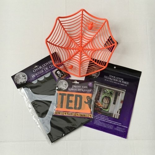 Halloween Bundle Decor: Halloween orange basket, Haunted Fright tape, Chair cover, Door cover