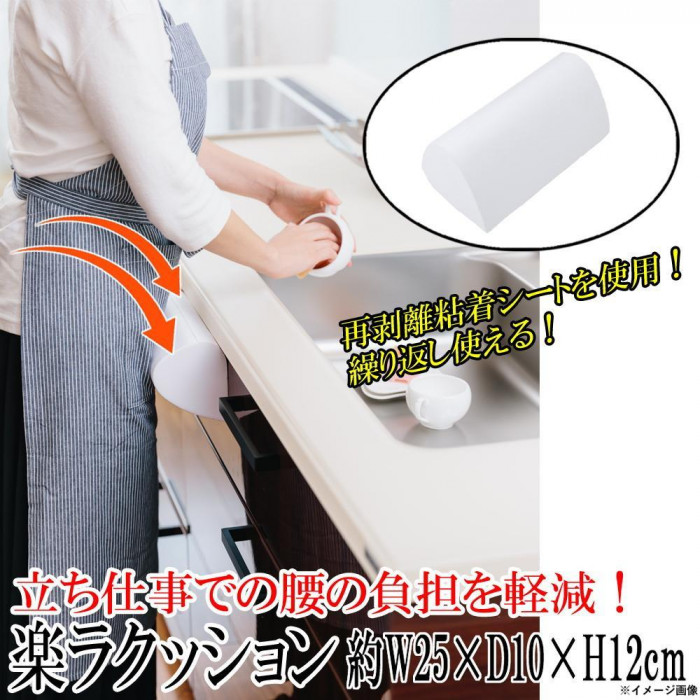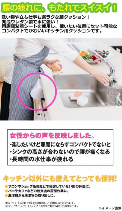 洗い物や立ち仕事も楽になる腰クッションです。発泡ウレタン製で水に強く、汚れてもサッと一拭きでお手入れOK。また、吸着部には再剥離粘着シートを使用しているので、身長に合わせて使用位置の調整が可能。繰り返しいろんな場所で使えます。 |