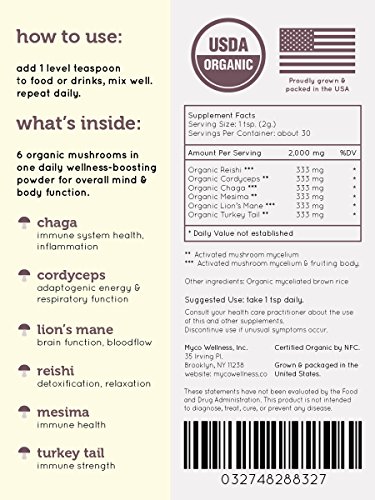 -. Feature : Contains six of the most powerful organic mushrooms for overall mind and body wellness. / Easy to add to coffee, tea, smoothies or anything else. / Contains 30 teaspoon sized servings. / Grown and packaged in the United States for better traceability! / 100% Satisfaction Guaranteed. Contact us with questions and we'll make it right.