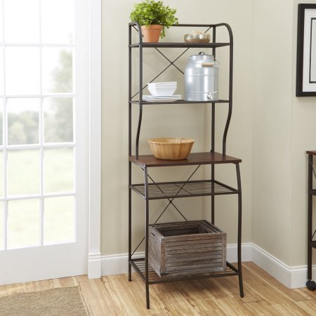 Product Description Add useful storage to your kitchen or pantry area with the Mainstays Mixed Material Baker's Rack. It features five spacious and sturdy shelves, which provide a handy solution to limited or cluttered counter space. The simple style of this mahogany wood rack blends well with a wide range of decor choices so that you can update your space easily. Generously sized, it allows you to store lots of canned goods, dishes, small appliances or other items as needed. The antique finish on this hammered bronze metal rack is attractive, yet understated to help it fit in with your kitchen. Showcase your favorite dishes, knick knacks or other collections for guests with this rack. 0