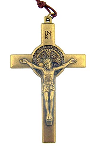 Saint St Benedict of Nursia Cross 3 Inch Bronze Tone Crucifix on Cord Chain