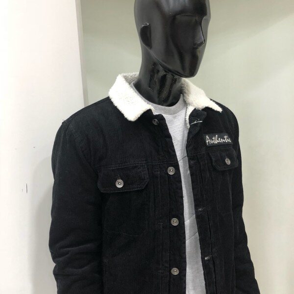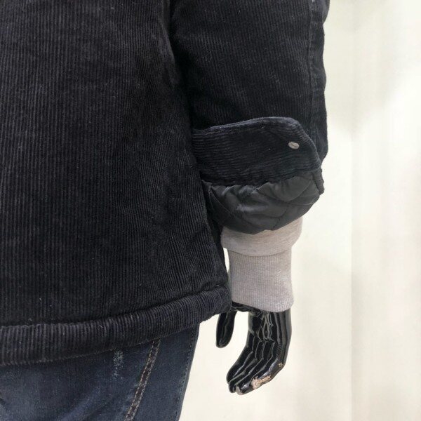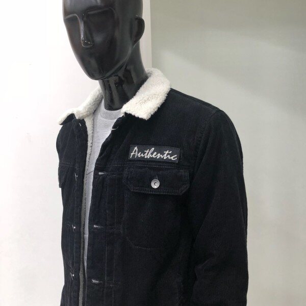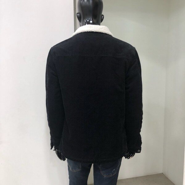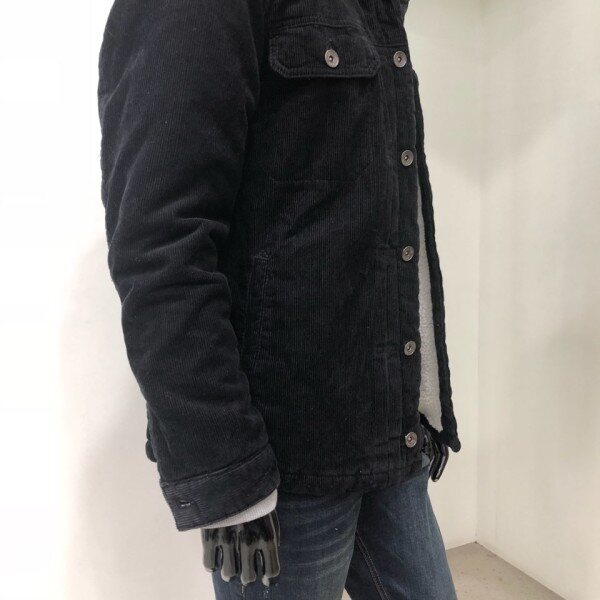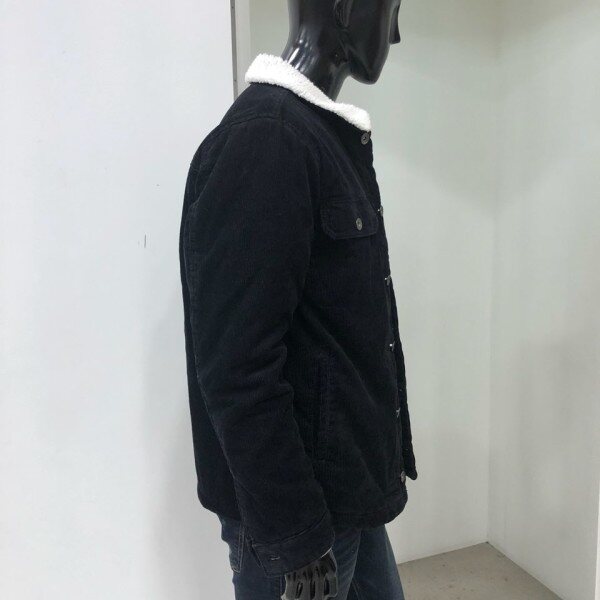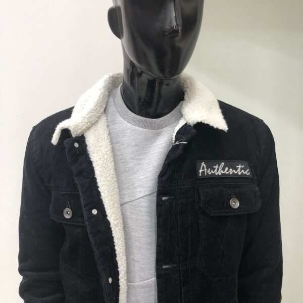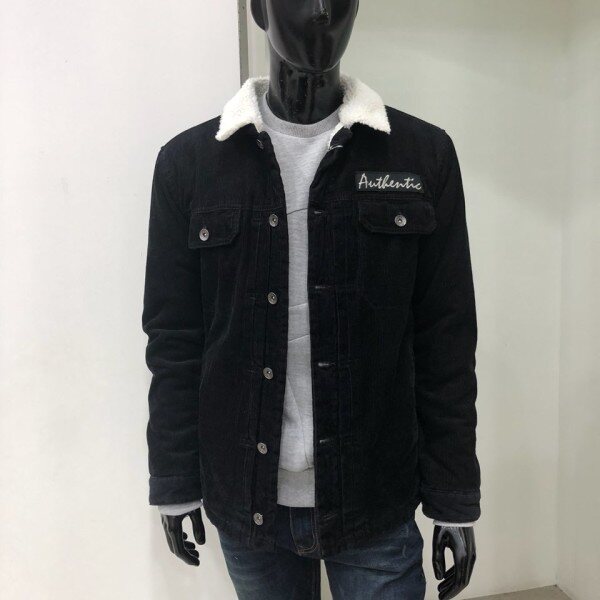 2018년 겨울 신상 남성 블랙 컬러 코듀로이 시어링 데님 점퍼 입니다. 따뜻한 느낌의 코듀로이 소재를 사용한 겨울트러커 자켓으로 안쪽에 아이보리 컬러의 시어링 FUR를 부착하고 소매에 패딩을 넣어 보온성을 강화한 아이템 입니다. 트렌드한 소재인 코듀로이와 어떤 옷에도 무난하게 어울리는 블랙컬러가 대중성있으면서도 멋스럽게 착장시킬 수 있는 디자인 입니다.